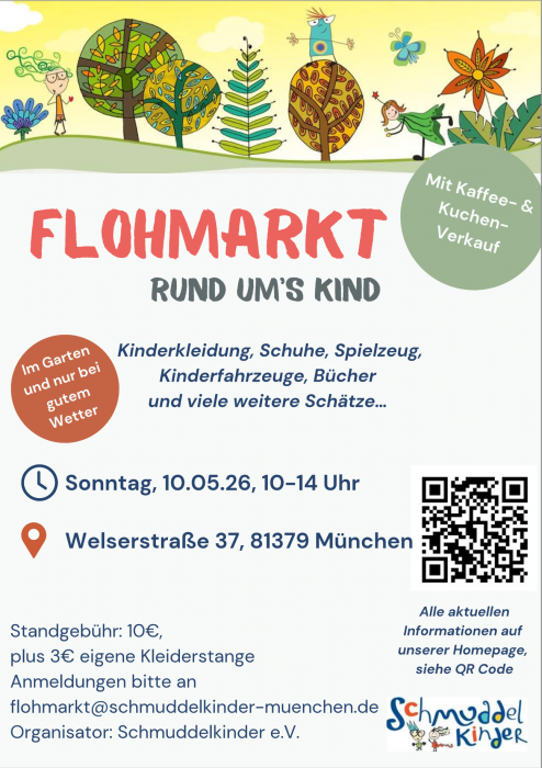 Am Sonntag, 10. Mai 2026, veranstalten wir bei gutem Wetter von 10-14 Uhr einen Flohmarkt vor unserem Kindergarten. Dort gibt es alles rund um’s Kind: Kinderkleidung, Schuhe & Spielzeug. Zudem bieten wir Kaffee, Kuchen und Snacks an.